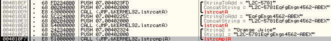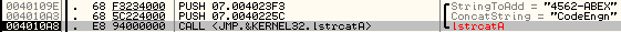 lstrcatA함수를 거치고 나면 "4562-ABEX"와 C 드라이브의 이름인 "CodeEngn"이 합쳐지게 됩니다.