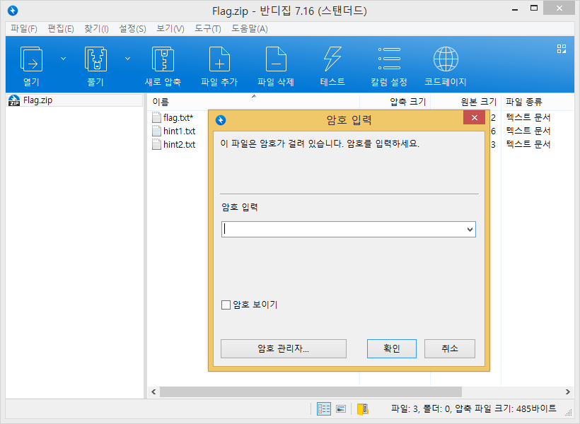 세 개의 파일 중 flag.txt.를 제외한 두 개의 파일은 암호 없이 열 수 있습니다.