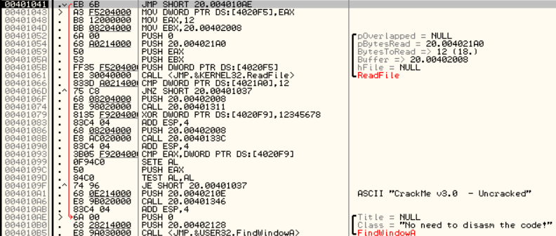 그랬더니 EAX에 0x000000E8이라는 값이 들어가고 이 부분에서 점프를 하면서 ReadFile함수를 거쳐가게 됩니다.