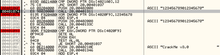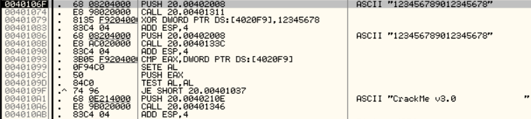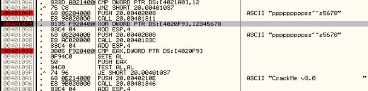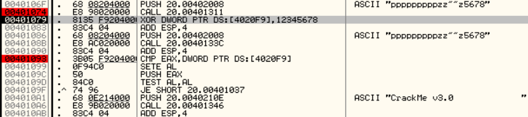EAX에는 입력한 문자열의 마지막 4글자의 아스키코드값이 들어가고 4020F9에는 0x00401074함수에서 만들어진 값과 0x12345678을 XOR 한 값이 들어갑니다.