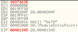 5, 6, 7, 8의 아스키코드값인 0x35, 0x36, 0x37, 0x38이 EAX에 오른쪽부터 순서대로 들어간 모습입니다.