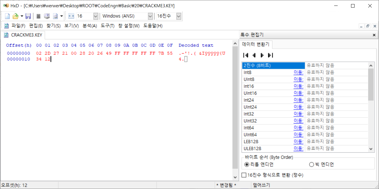 'Cracked by: CodeEngn!' 문구가 출력 되도록 하려면 crackme3.key 파일안의 데이터는 무엇이 되어야 하는가