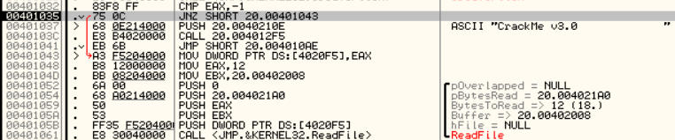 ReadFile함수를 자세히 보면 pBytesRead = 20.004021A0이라는 부분이 있습니다.