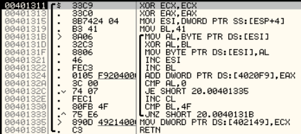 복잡한 함수는 아니고 0x00401311 함수에서 만들어진 문자열의 마지막 4글자의 아스키코드값을 EAX에 넣는 간단한 코드였습니다.