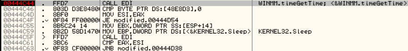 timeGetTime함수를 2번 호출해서 두 값을 비교하는데 ESI에 있는 값이 더 작을 수밖에 없고 점프합니다.