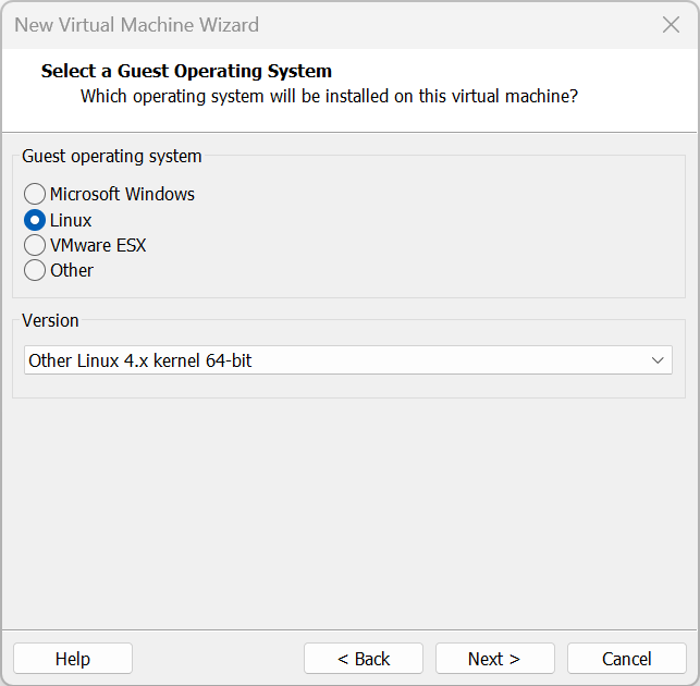 다음 창에서는 Linux를 선택해주고 Other Linux 4.x kernel 64-bit를 선택해줍니다.