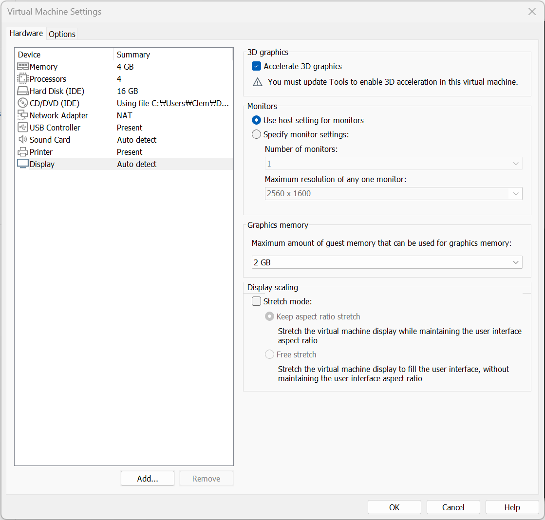 그다음 가상 머신 설정에 들어가서 3D 그래픽 가속을 켜주고 그래픽 메모리도 적당히 할당해주겠습니다.