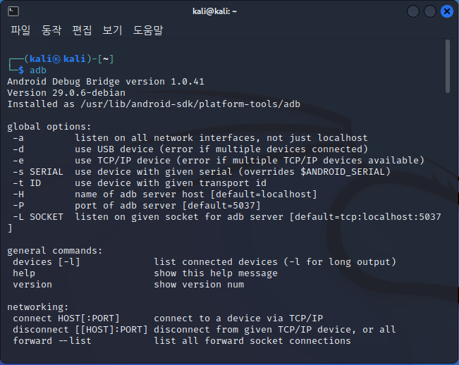 설치 후 터미널에 adb라고 입력하면 도움말이 잘 뜨는 것을 확인할 수 있습니다.